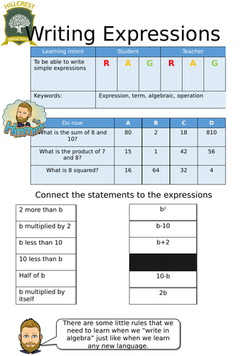Writing Algebraic Expressions Worksheet Teaching Resources